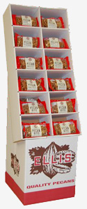 Note: Our cello packaging is color coordinated, red for Pecans, green for Walnuts, blue for Almonds, and yellow for Peanuts. We are proud to say that continually the majority of our Pecans are Texas grown. Our quality products all carry a 13 month expiration date which is rare in this industry. Most companies have a longer expiration date. Cello items are produced and shipped year-round. Additionally to assure great pricing, all items are priced year-round with three seasonal promotions: SPRING, SUMMER, and HOLIDAY. Our shelled pecans are Kosher certified and all of the Ellis grocery packaging carries the Texas Department Of Agriculture's "GO TEXAN" logo. Our grocery/cello products division also packages and delivers Private Label products. Additionally, we recently have started our own on-site canning operations. Where retail coverages are needed, we have 8 different reputable brokers representing our companies/products so we can monitor and cover our large distribution areas.